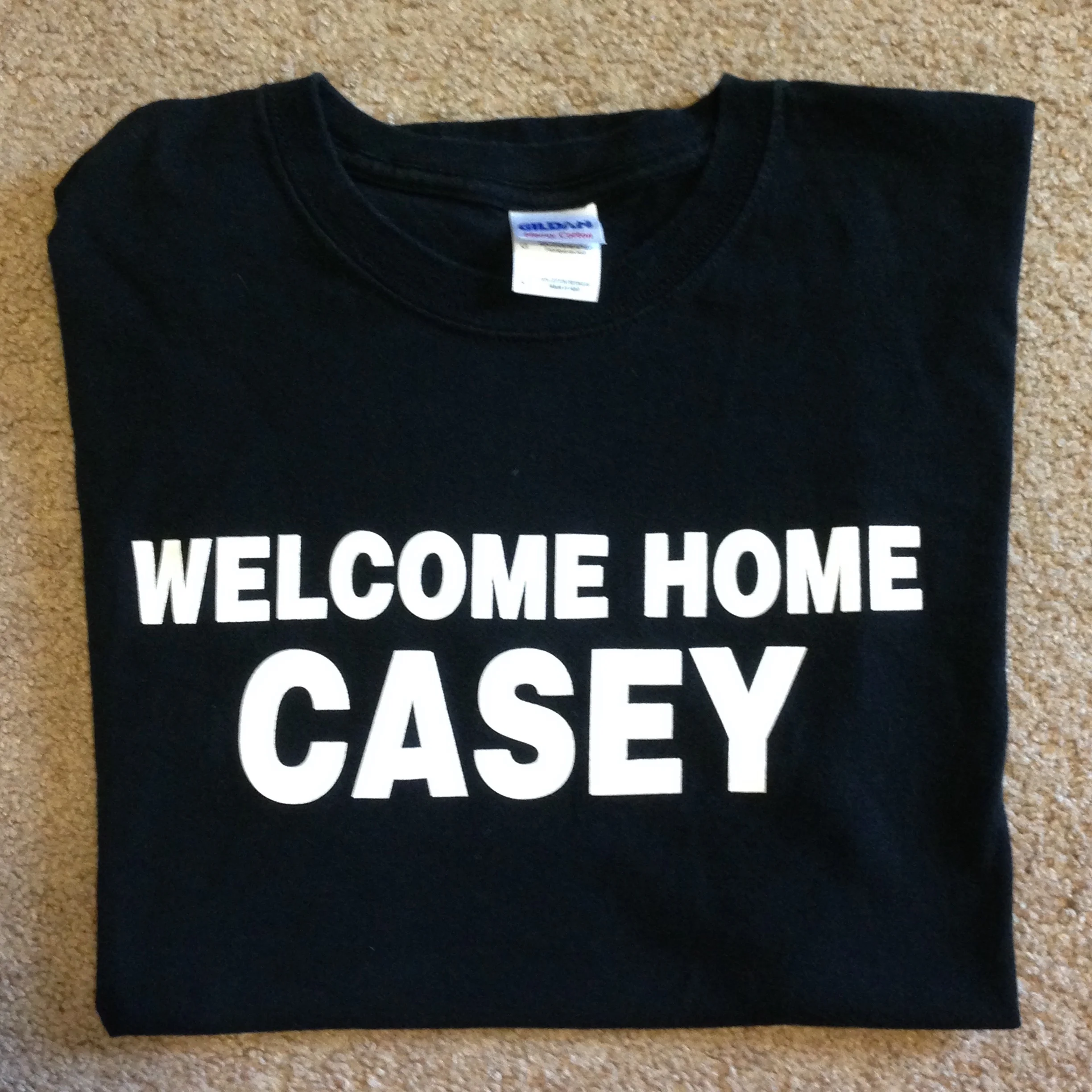 When I see the text WELCOME HOME CASEY, my mind races with activity. I imagine a mid-50s mother with reading glasses on a ubiquitous custom t-shirt website, methodically assembling the text. She hovers over shirt colors, deciding between blue and black. Then my imagination twitches. I imagine the Casey figure, a tall stony-faced man in combat dress. He’s striding through an airport with two large duffle bags. My imagination twitches again. Casey is now a girl, a junior in college, and she’s being thrown a surprise party after studying two semesters in France. A small group of friends is hiding in her apartment, laughing to the themselves about the absurdly austere shirt they are all wearing.